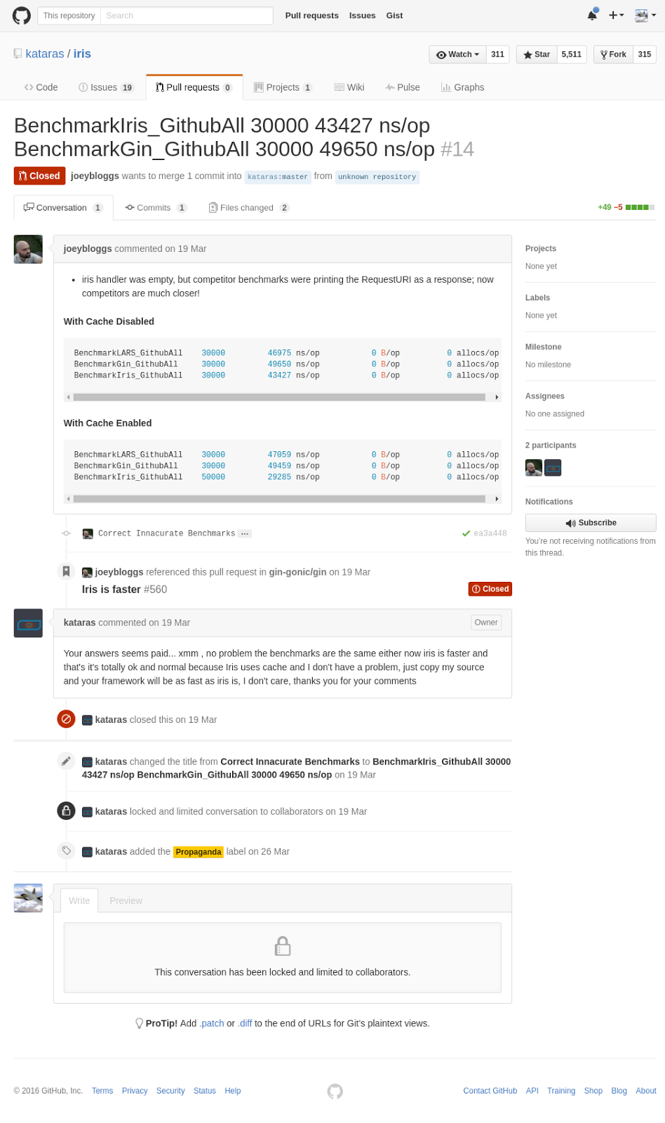 The thing that seem to attract the most people are benchmarks. What many people don't realize is that the benchmarks have been debunked a few good times. Take for example this PR to change the results of a well known benchmark comparing the various http routers Go has and read this comment and the following ones. Fortunately there people were not tricked by iris caching your responses. How would you feel if your API would suddenly get a cache without you asking for it? Probably in some cases it would be ok but what about cases where it's very important not to? Simply by having caching turned on by default, iris is not playing on a even field as as the rest of out there which allow YOU to have control over YOUR application, the way it should be. To this day the author refuses to acknowledge this.